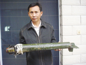 昨天一大早,記者來到朱賢文家,那是一幢很漂亮氣派的別墅式的小三樓建筑,樓下還開有一家小店。小朱正在院子里盤弄著一個(gè)類似火箭彈一樣的綠色物體,在他腳下的一只破臉盆里,凌亂的放著些黑色部件。小朱說,這些零部件都是彈體上掉下來的,他也不知道是些什么玩意。附近多名村民也圍聚在小朱家中,一邊看稀奇一邊熱議這到底是個(gè)什么東西,同時(shí)探討小朱該到何處去尋求賠償。