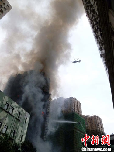 在火災(zāi)現(xiàn)場,記者看到,起火高樓外表已被燒黑,現(xiàn)場火勢洶洶,濃煙滾滾;附近道路地面上覆蓋了大量灰燼,水流滿地;周邊方圓數(shù)百米內(nèi)充滿了煙霧和刺鼻的氣味;來自交警方面的信息稱,失火大樓周圍數(shù)條道路已被封鎖。記者看到,不僅消防車緊急出動,警用直升飛機(jī)也參與高樓救援。