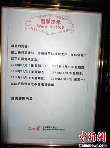 在四星級(jí)的臺(tái)州國(guó)貿(mào)飯店大堂,記者看到一張通知:接文廣新局通知,本市娛樂(lè)行業(yè)將要進(jìn)行節(jié)能減排輪休,因此本飯店(KTV)在10月25日、11月2日、11月10日、11月18日暫停營(yíng)業(yè)。