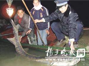 “開(kāi)始不知道是什么東西,只覺(jué)得它力氣特別大,把水撲騰得嘩嘩直響!”捕獲中華鱘的邗江區(qū)李典鎮(zhèn)沿江村漁民胡長(zhǎng)發(fā)告訴記者,當(dāng)晚,他和兒子一起駕小掛槳船在頭橋長(zhǎng)江夾江深水區(qū)用流刺網(wǎng)捕魚(yú),開(kāi)始收第一網(wǎng)時(shí),感到很重,費(fèi)了九牛二虎之力,將魚(yú)拖出水之后,憑經(jīng)驗(yàn)看,應(yīng)該是中華鱘。由于魚(yú)太大,結(jié)實(shí)的流刺網(wǎng)已經(jīng)有好幾處被它“拱”破了!斑@可是國(guó)家保護(hù)魚(yú)類(lèi),快打電話(huà)報(bào)告!”老胡當(dāng)即通過(guò)村干部通知漁政部門(mén)。隨后,他與兒子及另外一個(gè)漁民用粗繩子牽住中華鱘,3人一起用力往岸邊靠,幾分鐘的水路,足足花了40多分鐘。