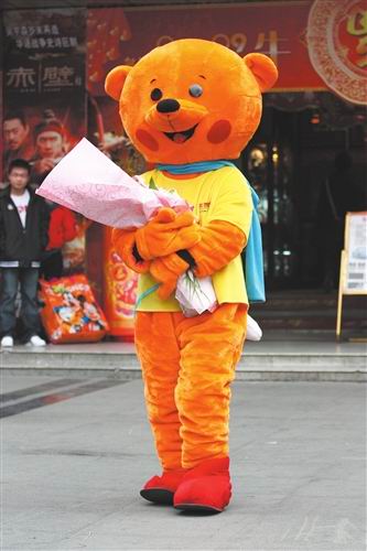 伴著掌聲,一只“小熊”手捧一束粉紅色的玫瑰,從影城內(nèi)走了出來!斑@不就是剛剛在門口發(fā)宣傳單的卡通公仔嗎?”眼尖的旁觀者認出它。只見胖乎乎的“小熊”邁著笨拙的步子走到女孩面前獻上玫瑰,隨后取下頭套,和女孩擁抱在了一起。原來,他就是電子屏幕上的男主角。