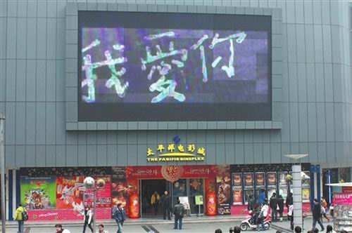 昨日(1月8日)下午3點,人來人往的成都青年路某影院前,一只胖乎乎的“小熊”正在向人群散發(fā)宣傳單。而影院上方的電子屏幕卻突然插播起一條尋人啟事,請現(xiàn)場一位叫“李嬌”的女孩趕緊朝屏幕招招手。“這是在做什么。俊毙腥思娂姾闷娴赝O履_步,一名長發(fā)女孩茫然地伸出手揮了揮之后,明星謝娜竟也出現(xiàn)在了屏幕上:“名叫李嬌的女娃娃,你好。你的男朋友讓我告訴你,他很愛你,想一輩子照顧你,永遠和你在一起!迸⑽孀∽彀停坪醪桓蚁嘈叛矍暗倪@一幕。緊接著,一旁的“小熊”給她獻上了一束玫瑰,突然脫下頭罩,和她擁抱在了一起。原來,這是一場街頭上演的愛情告白。