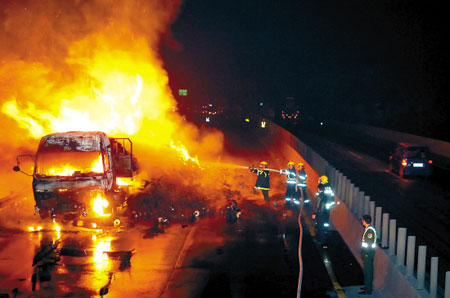 昨天是春運(yùn)第一天,記者在京珠高速粵北段采訪時(shí),恰好目睹一輛大貨車自燃的全過程。事故純屬偶發(fā),但救援中暴露出的一些問題,可以說是給今年的春運(yùn)敲響了警鐘———