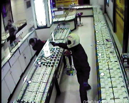 現(xiàn)場錄像顯示,當(dāng)晚7時(shí)20分30秒,一歹徒手持鐵錘,將一柜臺(tái)的玻璃敲碎,將里面的金屬飾品物品放進(jìn)手提包;5秒后,持槍歹徒在一個(gè)角落用槍托狠砸店主何先生頭部;14秒后,珠寶店兩名工作人員趁亂逃離現(xiàn)場;29秒后,手捂頭部的何先生欲離開現(xiàn)場,被歹徒喝令退回,歹徒上前用手槍再次砸傷何先生頭部,并在店內(nèi)慌亂走動(dòng);51秒后,持鐵錘歹徒先逃離現(xiàn)場,持槍歹徒緊跟欲逃離;54秒后,持槍歹徒被民警制服。