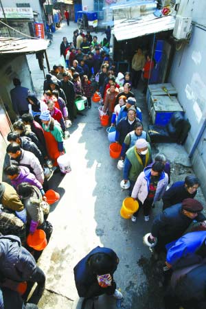 目前,松江當地居民情緒比較平穩(wěn),有序地在送水車或消防龍頭前排隊等候取水。