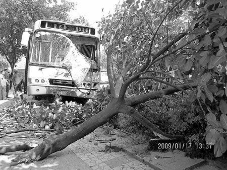 一位目擊者告訴記者,車禍發(fā)生后,36路車是與同方向開行的66路車發(fā)生追尾撞的,66路車“傷情”較輕,已經(jīng)被交通拯救車拖走。而36路連續(xù)發(fā)生碰撞后,被卡在裸露在人行道上的樹根上,再加上該肇事車駕駛室嚴重損壞,善后處理工作難度較大,需要時間吊轉(zhuǎn)。