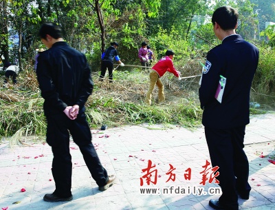 16日,東平路口仍然停滿了警車。為了進(jìn)一步查找,同時(shí)也為了以后此處草叢不再“藏污納垢”,東平村委叫來(lái)幾名婦女將雜草清除。