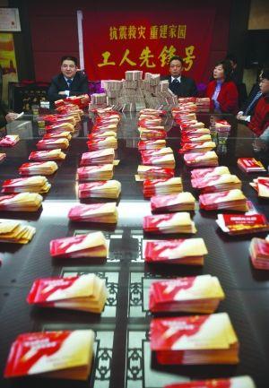 將近三百萬元現(xiàn)金堆在桌子上,看起來有點(diǎn)“夸張”,但它們?cè)诩磳⒁偷募t包中,只占現(xiàn)金量的十分之一左右!這次去災(zāi)區(qū),陳光標(biāo)與63位企業(yè)家捐贈(zèng)與籌集的現(xiàn)金總額約3000萬元,另外還有大米、豬肉、食用油、羽絨服、毛衣等物資,價(jià)值3000多萬元。其中,陳光標(biāo)的黃埔再生資源利用有限公司捐贈(zèng)現(xiàn)金300萬元。