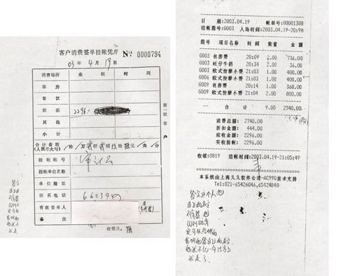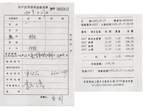結(jié)賬小票上列明的服務(wù)包括貴賓包房費(fèi)、鐘費(fèi)、加鐘、小費(fèi)、飲料等。第一次消費(fèi)的時(shí)間為2003年4月19日,入場時(shí)間為晚8點(diǎn)09分,結(jié)賬時(shí)間為晚9點(diǎn)05分?傁M(fèi)金額為2296元。其中,包房共計(jì)3間,費(fèi)用為1104元(368×3);歐式按摩小費(fèi)共有3筆,其中兩筆分別為400元,另一筆則標(biāo)明數(shù)量為2,金額為800元。另一份賬單的時(shí)間為2003年9月27日,入場時(shí)間為晚上8點(diǎn)03分,結(jié)賬時(shí)間為晚9點(diǎn)10分?傁M(fèi)金額為1498元。其中“貴賓包房費(fèi)”是498元,鐘費(fèi)是200元,加鐘是200元,小費(fèi)是600元。