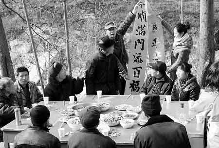 這一桌豐盛的酒菜,是常年在長安區(qū)大峪口龍石溝利用業(yè)余時間義務植樹造林的郭建民一家精心準備的,專門宴請龍石溝的15戶村民一同提前吃年夜飯。