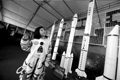 當天下午,設在騰龍閣的航天科技體驗場不斷有三五成群的游人進出,神七返回艙的全尺寸模型、嫦娥一號的實物火箭殘骸、剛剛研制出來的長征五號運載火箭的微縮模型……站在只有在電視上能見得到的航空物品前,小朋友拉著爸爸媽媽問個不停。旁邊,等待試穿宇航服的游客自發(fā)排起隊,準備過把“航天癮”!吧駳獍桑旖o我拍一張!焙蟻砭﹦展と藛T張淼第一次逛廟會,穿好宇航服后,他立即站到太空照片的背景前拍照留念。