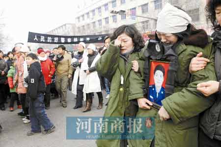 在前往遺體告別儀式舉行地——中牟縣殯儀館時(shí),不足5公里的路段,送行的隊(duì)伍被4次攔住,行走了一個多小時(shí)。途中不少負(fù)責(zé)執(zhí)勤的交警,一只手在敬禮,而另外一只手則悄悄在抹眼淚。