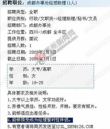 2月3日下午,成都招聘網(wǎng)上一條招聘信息讓網(wǎng)友驚詫不已,這是北京某科技公司成都辦事處招聘一名經(jīng)理助理,要求女性,大專(zhuān)、高職即可,年齡在19至25歲,以及其他一些常規(guī)招聘要求。隨后在“具體要求和相關(guān)說(shuō)明”一欄中,有兩條要求別出心裁,是眾多求職網(wǎng)友從沒(méi)見(jiàn)過(guò)的。第二條:形象氣質(zhì)佳,性格開(kāi)放、開(kāi)朗。要求有照片;第四條:能夠接受成為經(jīng)理暫時(shí)性伴侶。招聘信息中還留有招聘單位的聯(lián)系人、電話和郵箱。