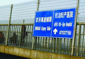 時先生所指的指路牌有四塊。其中一塊懸掛在新發(fā)地長途客運(yùn)站門前的過街天橋南側(cè)護(hù)欄上,正下方為進(jìn)京方向輔路。這塊藍(lán)底白字的牌子上,并排印著京開高速輔路和某家婦產(chǎn)醫(yī)院的字樣,旁邊還有相應(yīng)的英文和箭頭指明方向,并留有醫(yī)院電話。