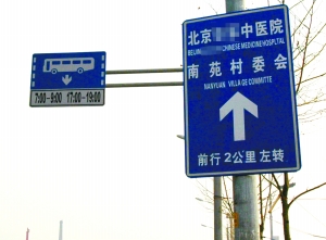 看到新聞爆出立水橋附近的“山寨路標(biāo)”,家住新發(fā)地的時先生發(fā)現(xiàn),自家附近也有這樣“雷人”的指路牌,分別指向附近的兩家醫(yī)院和南苑村委會。