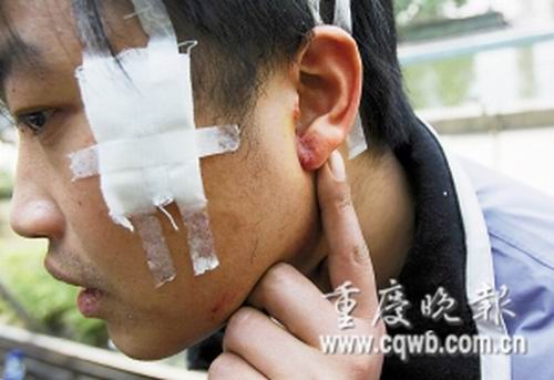 小販夜市擺攤,城管隊(duì)員去阻止,引發(fā)雙方打斗。打斗中,小販一棒擊中城管隊(duì)員腰部,而城管隊(duì)員一口咬破小販耳垂!叭湫小卑l(fā)生在九龍坡區(qū)黃桷坪,昨日,小販李利捂著耳朵去找對(duì)方理論。