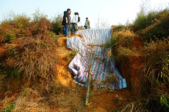 當(dāng)?shù)匾恍┐迕褚仓肋@起發(fā)生于2008年底的盜墓案件。不過,古墓究竟是什么樣子?墓中出土了什么器物?村民們都不甚了解。一位村民說:“當(dāng)時(shí)公安局和文物局的人都來了,他們在墓邊上挖了很多土溝,還發(fā)現(xiàn)了一塊絲綢呢!绷硪晃淮迕衩枥L說,絲綢底色呈綠色,上面繡有一只鳳凰,“鳳凰好像是黃色的。”