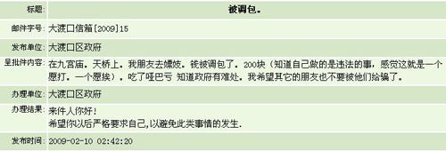昨日上午,市人大代表鄧明鑒打開(kāi)市政府公眾信息網(wǎng),瀏覽公開(kāi)信箱辦理情況,發(fā)現(xiàn)大渡口區(qū)政府辦理的一群眾來(lái)信搞錯(cuò)對(duì)象:一市民反映朋友嫖妓遭調(diào)包,政府卻要求這位市民要嚴(yán)格要求自己!
