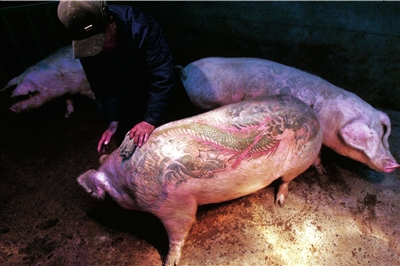 記者看到,還有9頭文身豬在寬敞明亮的豬圈中,而原來一起長(zhǎng)大的3個(gè)同伴都準(zhǔn)備前往歐洲,并被賣出了70萬到100萬元人民幣的高價(jià)。9頭豬都是母豬,剛滿周歲。“因?yàn)槟肛i更耐痛,文身更方便。”飼養(yǎng)員潘師傅說。見到生人進(jìn)到豬圈,豬開始不安分地嗷嗷叫。這幾頭豬的體重都在400斤以上,長(zhǎng)得極為肥碩。它們身上都文有精美的圖案。“這頭文著龍紋標(biāo)志的豬就叫大龍,文著美人魚的就叫美人魚,它們的名字都是根據(jù)花紋取名的!逼渌i身上文著宗教畫、中國年畫和卡通圖。
