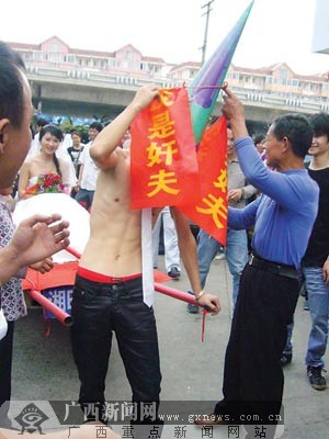 2月16日下午3時(shí)許,記者在南寧市葫蘆鼎大橋上看到了這支接親隊(duì)。走在最前面的新郎手拉一輛“牌照”為“湘E-88888”的平板車,平板車雖顯破爛,卻布置一新,上面還掛著橫幅“我是毛××今天討婆娘”。新郎的頭頂上還戴了一個(gè)錐筒形狀的綠帽,臉則被畫得滑稽非常,脖子上系著一條略顯夸張的白領(lǐng)帶。他上身并未穿衣,只掛著綢緞,上書“我是奸夫”字樣。