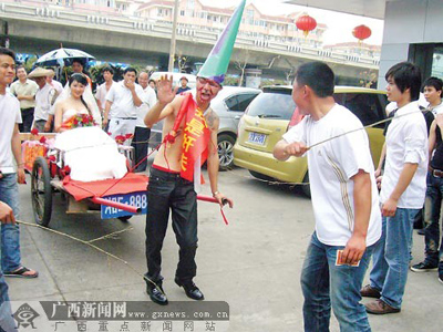兩位新人的老鄉(xiāng)趙先生參與策劃了這次接親活動(dòng)!斑@樣惡搞其實(shí)就是圖個(gè)熱鬧!”趙先生告訴記者,在老家邵陽(yáng),每家人迎親時(shí)都要大鬧一番,形式不限,花樣翻新,越熱鬧越好,“有句話叫‘結(jié)婚三日無(wú)大小’,說(shuō)的便是結(jié)婚那幾天不必計(jì)較輩分,誰(shuí)都可以拿來(lái)惡搞。因此,新郎的父親也被拉進(jìn)迎親隊(duì)伍,甚至遭到‘鞭打’。而新郎在迎親當(dāng)天一定要吃夠苦頭,有車不能坐,要拉著新娘走,被鞭打更是家常便飯”。