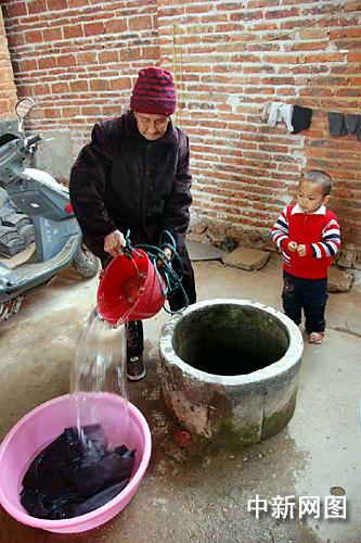 或許是怕我們不相信,一直靜靜地坐在一邊聽我們談話的老人站起來,拿著一個(gè)紅色的塑料桶來到前院的井邊提了兩桶水,倒在一旁的盆里自顧洗起衣服來。井很深,桶雖不是很大,但一桶水起碼也有近十斤,若非親眼所見,實(shí)難相信一位百歲以上的老人能如此輕松自如地提上來。