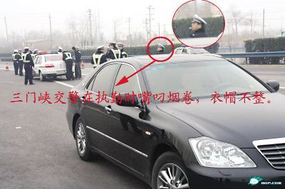 在帖子中,“一鍵盤敲死你”稱,開車經(jīng)過三門峽時被交警攔下,由于他車牌上的一顆螺絲釘遺失,交警為此罰款2000元,還沒有給任何收據(jù)。無奈之下自己稱沒錢,交警便沒收了他的車載GPS等車載電器。他還稱,交警隊員曾對他口吐污言穢語,并且交警衣帽不整、酒氣熏天。在網(wǎng)友用手機拍下的照片中可以看到,有一位交警嘴里叼著香煙,另有一位交警沒戴帽子在與司機交談。
