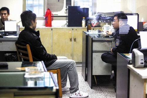 昨天下午4點(diǎn),記者在較場(chǎng)口派出所的詢問(wèn)室外,隔著玻璃看到了這名小伙子。他身高大約1.65米,身穿黑色冬衣,栗黃色的頭發(fā)十分蓬亂,臉上和脖子上臟兮兮的,目光有些呆滯。