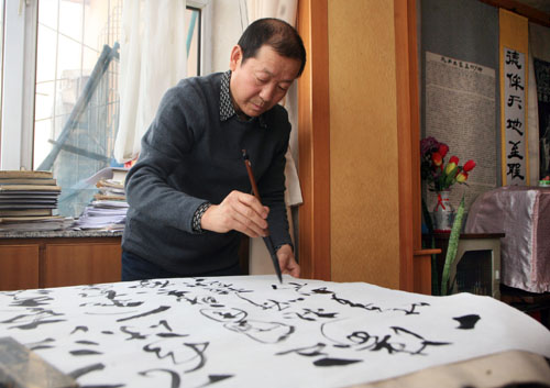 記者在烏市昆侖東路孔祥福家看到,客廳正中間的墻上掛著一幅十多年前他從山東孔府帶回來的孔子碑拓畫像。畫像四周的墻壁上,還掛著別人的或他寫的關于論語、家族的字畫。