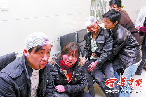 在鳳城醫(yī)院急診科,看見丈夫陳國(guó)權(quán)滿臉血跡,頭裹紗布無力地靠在大廳的椅子上,王克云立即失聲痛哭。陳國(guó)權(quán)說,頭上剛縫了6針。鐘文榜傷勢(shì)更嚴(yán)重,滿臉的血跡已凝結(jié),頭裹紗布,左腿已不聽使喚!八麄儍扇舜蛭乙粋(gè)!辩娢陌裾f。自己看見打人的頭戴著紅色的安全帽,上面有“中國(guó)華西”幾個(gè)字!笆俏(在外面)報(bào)的警,他們看見我報(bào)警了,追出來把我一陣亂打!币慌缘耐蹩饲暹呎f邊流淚。