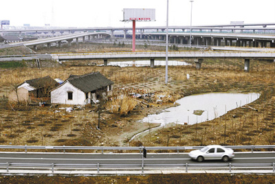 跨過一張已經(jīng)被撕裂的鐵絲網(wǎng),快速奔過兩條雙向六車道的高速公路和往上海方向的匝道,那呼嘯而過的車輛讓我不寒而栗。強壓住內(nèi)心的恐懼,繼續(xù)翻越往杭州方向的匝道,往前三百米,又穿越高架匝道,邁過雜草叢生、凹凸不平的地面,再往里前行二百米后,隱約看見一戶被條條匝道環(huán)繞著的小屋。據(jù)村民介紹,這條“長征路”是唯一能到達王來英家的“通途”。