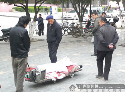 25日中午,一位靈川縣城的讀者致電本報桂林新聞熱線稱,她今天上午經(jīng)過靈川商貿(mào)城門口,看到一名年輕女子推著一架推車,上面躺著一具“尸體”!笆w”用一床毯子嚴嚴實實地從頭包裹,只露出兩只腳。中午她再經(jīng)過那里時,發(fā)現(xiàn)推著“尸體”的變成了一個小伙子了。這種乞討方式太恐怖了,很多人繞道走,當然也有人施舍錢。