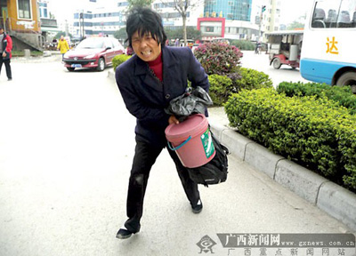 2月25日下午,在靈川縣商貿(mào)城門口,一名男子推著一具包裹得嚴嚴實實的“尸體”在討錢。當記者提出要幫他找有關(guān)部門解決困難時,男子急忙“收攤”,拖著“尸體”離開。記者跟著他們,只見那具“尸體”忽然爬起來,抱著滿滿一桶討來的錢邁著矯健的步伐逃開。