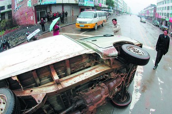 昨日下午1時30分許,在(湖南)瀏陽市沙市鎮(zhèn)發(fā)生一起交通事故,當?shù)亟还苷疽惠v執(zhí)法車撞翻一輛裝有瓶裝液化氣的小貨車,貨車中兩人受傷。當?shù)亟还苷矩撠熑吮硎具@是一起普通交通事故,但目擊者說,交管站執(zhí)法人員開車追趕1公里后,想迫使小貨車停車時撞翻了對方。小貨車司機也堅稱,執(zhí)法車“向自己的車連撞兩次”。
