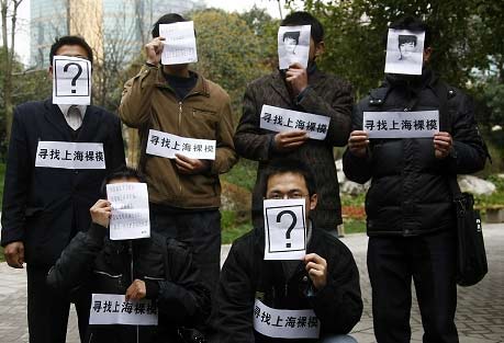 昨天上午,記者接到讀者報(bào)料趕到華山路、延安中路路口的天橋,遠(yuǎn)遠(yuǎn)就看見(jiàn)有7名男子身前貼著一張印有“尋找上海裸!弊謽拥募垙?jiān)跇蛎嫔弦蛔峙砰_(kāi),引來(lái)多名行人圍觀,旁邊還有兩名女性工作人員正在給行人介紹相關(guān)活動(dòng)內(nèi)容,由于天橋上行人不斷投來(lái)異樣的眼光,身貼字條的7名男子也不由自主地從站立改成了蹲姿。記者注意到,工作人員在向路人介紹時(shí)還提到了“為白血病人慈善募捐”。十幾分鐘后,圍觀的行人越來(lái)越多,引起了城管人員注意,隨后城管人員以影響交通為由將一行人請(qǐng)下了天橋,一行人下天橋后,直接走進(jìn)靜安公園內(nèi)!罢新隳U械浇诸^了,太夸張,先不說(shuō)會(huì)不會(huì)真有人應(yīng)聘,但這種招聘行為很不文明!笔忻耜愊壬f(shuō),更可氣的是對(duì)方竟把招裸模與慈善募捐聯(lián)系到一起,讓人費(fèi)解。記者隨后又采訪(fǎng)了數(shù)名經(jīng)過(guò)的路人,大家均表示策劃者此舉肯定是為了吸引眼球,并譴責(zé)這樣的行為影響社會(huì)風(fēng)氣。
