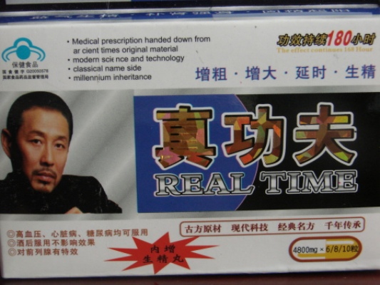 這個(gè)被網(wǎng)友戲稱為2009年度最牛的假?gòu)V告的壯陽(yáng)藥品名叫“真功夫”。盒子左側(cè)赫然印著陳道明的大頭像。盒身背后標(biāo)明的生產(chǎn)廠家是香港威龍科技有限公司,地址為香港告士打路科技大廈B座2806。而據(jù)一些熟悉香港的網(wǎng)友稱,這個(gè)地址根本是子虛烏有。而其批準(zhǔn)文號(hào)是冒用江蘇一家企業(yè)的。最雷人的是,這款擺明是假藥的壯陽(yáng)藥上還寫著“功效持續(xù)180小時(shí)”——網(wǎng)友笑言這款藥品持續(xù)時(shí)間竟然超過了中國(guó)最牛的手機(jī)超長(zhǎng)待機(jī)電池。