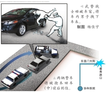 知情人透露,那輛本田車被搶后,該車司機(jī)立即撥打110報警,北京警方隨即向附近所有執(zhí)勤的民警、武警、警車發(fā)出圍堵命令,在全城范圍內(nèi)堵截這輛黑色本田車。上午10點(diǎn),一輛武警巡邏車和一輛110巡邏車按布控指令行駛到東直門內(nèi)大街時,發(fā)現(xiàn)了正在瘋狂逃竄的本田車,兩輛巡邏車立即鳴響警笛一路追去,并最終將本田車別住,抓獲犯罪嫌疑人。