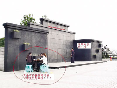 天涯網(wǎng)友“surperdry1”稱,15日那天,春光明媚,他帶上全家人到位于江津艾坪山的烈士陵園里面緬懷先烈。進(jìn)入陵園卻發(fā)現(xiàn)麻將聲聲,雞鳴不已,并配發(fā)大量照片以證實(shí)自己的話。此帖一出,立即引來網(wǎng)上熱議。烈士陵園怎能受到如此待遇?“surperdry1”還說,盡管草坪上有石碑警示路人“請(qǐng)您尊重安息在陵園內(nèi)的革命英烈,用文明的言行維護(hù)陵園的莊嚴(yán)肅穆”,但游人仍然我行我素。