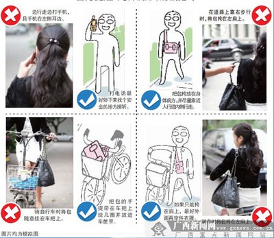 逢出門必拿包的女子,很容易成為飛車賊的下手對象。女性外出時,應(yīng)該如何防止被搶?昨日, 長期在打擊“兩搶”戰(zhàn)線上的南寧市公安局西鄉(xiāng)塘分局刑偵二大隊的民警們,向市民傳授了一些方法。警方通過媒體提醒廣大市民,外出時注意保管好自己隨身攜帶的背包,一旦遭遇飛車搶奪,請在第一時間報警。