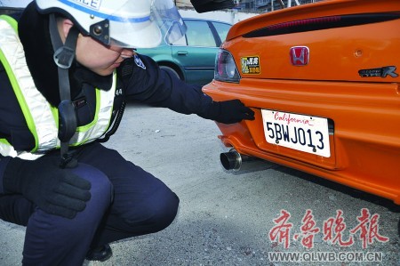 17日下午,煙臺(tái)市交警一大隊(duì)交警在南大街路段巡查時(shí),查住一輛雷人的老款本田轎跑車,該車車牌寫的全是外文。據(jù)駕駛員本人講,這副車牌是美國加利福尼亞州的車牌,他覺得洋車牌新鮮、氣派,便找別人弄到一副作廢的掛上了。交警表示,這種做法顯然是違法的,車主將面臨處罰。(記者 張琪 通訊員 趙亞林 溫全福 攝)