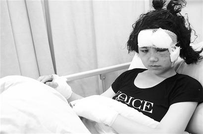 昨日上午9點(diǎn)半,在華西醫(yī)院急診科,馮曉蘭的兩名女同學(xué)正為她打理頭發(fā)。被鮮血浸透,頭發(fā)凝結(jié)成了一塊,根本無法梳理。經(jīng)過幾天的治療,馮曉蘭的傷勢已明顯好轉(zhuǎn),但紅腫的雙眼及面部的瘀痕依然清晰可見,緊裹紗布的雙手至今還不能動彈。她說,由于身體還處在恢復(fù)期,這些天來,起居都是由同學(xué)輪流照顧。