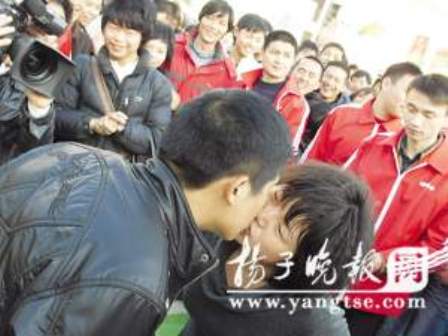當(dāng)天下午,一商家為了推銷新開發(fā)的果汁飲品產(chǎn)品,在宿遷市區(qū)舉辦一場(chǎng)“KISS我最!钡慕游谴筚惢顒(dòng)。大賽規(guī)定,參賽雙方接吻時(shí)必須雙手背在身后,單腿站立,嘴唇吻在一起,誰(shuí)的時(shí)間長(zhǎng)誰(shuí)就是冠軍。獲得冠軍的將當(dāng)場(chǎng)獲得2009元現(xiàn)金,亞軍將獲得1001元現(xiàn)金,季軍也有520元的獎(jiǎng)金。