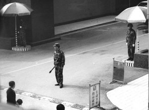 一位在案發(fā)后參與值勤任務的保安說,平時部隊門前共有三名哨兵值勤。兩人在大門外的崗哨上,一人在大門旁的傳達室內。崗哨上的其中一人持半自動步槍。監(jiān)控錄像顯示,案發(fā)時,大門外站崗的一名士兵剛好去打電話。嫌犯頭上戴著一頂黑色線帽,遮住了面孔,只露出兩只眼睛。他從石新路方向走進來,迎面走向持槍站崗的那名哨兵,越過了警戒線,哨兵剛要喝止他,他突然掏出槍,對著哨兵連開兩槍。哨兵中彈倒地后,他上前搶下哨兵的半自動步槍,轉頭向石新路方向跑去,后轉入小巷。