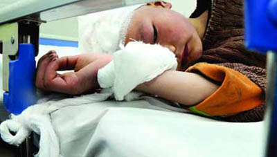 另一個(gè)受害孩子的家長(zhǎng)楊旗中正趴在ICU病房的門口,兒子楊自炎剛動(dòng)完腦部手術(shù)。為了防止孩子亂動(dòng),兩只小手被捆在了床旁的護(hù)欄上。