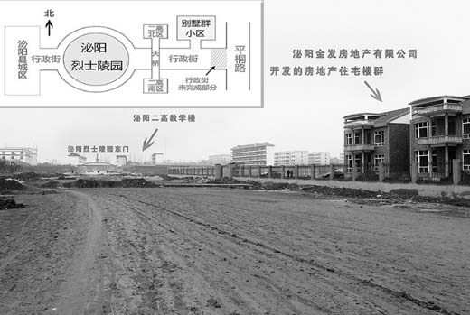 從空間位置上看,由金發(fā)房地產(chǎn)開(kāi)發(fā)公司所建的住宅樓在烈士陵園東側(cè)約1公里的地方,中間間隔了泌陽(yáng)縣第二高中校園。住宅樓及別墅區(qū)并沒(méi)有侵占烈士陵園土地。