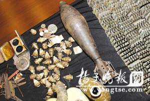 為什么如此熱衷于征集侵華日軍遺物?聽了張廣勝的自述,記者才知道原來他的外公就是在抗日戰(zhàn)爭中被日軍將雙眼弄瞎的。“小的時候我常聽身邊的老人們講故事,講到日本侵略者的暴行,在我心里留下了深深的烙印。后來工作了,有一次下鄉(xiāng),我還記得那是1998年,偶然在一個山村里見到一個放羊人,他將頭羊拴在地上吃草,而我驚訝地發(fā)現(xiàn),他用來拴頭羊的那根鐵桿竟然是日本二戰(zhàn)時最常用的三棱式刺刀。這使我一下子想起許多童年聽到的故事,我覺得有必要把這個刺刀帶回去給大家看看,從這開始我經(jīng)常利用業(yè)余時間上山下鄉(xiāng),去尋找當(dāng)年日軍在東三省留下的遺物!