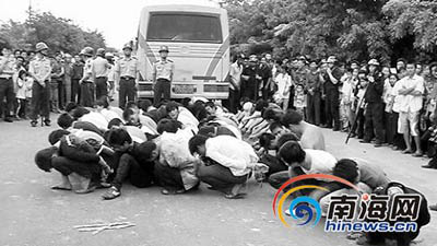 兩名沙場(chǎng)老板因經(jīng)營(yíng)利益問題產(chǎn)生糾紛,雙方各組織幾十人乘3輛大卡車持長(zhǎng)粉槍、長(zhǎng)勾刀等兇器欲進(jìn)行火拼。臨高警方得到消息后迅速組織160警力、20余輛警車圍追堵截,成功制止了一起聚眾斗毆事件,避免了流血事件發(fā)生。此次行動(dòng),臨高警方共查扣違法車輛6部,抓獲涉嫌持械斗毆嫌疑人58名。其中43人被刑拘、12人被行政拘留、3人待查。