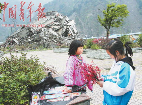 這里是映秀鎮(zhèn)“5·12特大地震”遇難者公墓,安放著數(shù)千名地震遇難者的遺體,清明前的這個周末,不少遇難者家屬紛紛前來祭掃親人。山下,賣香燭紙錢的攤點上放著的一張張地震照片讓不少人暫時停下腳步。有的照片還被做成書簽,旁邊配上自己填的詞:“憶秦娥,5·12震中,二00八年五月。西風烈,震龍沖出火五月;鹞逶,映秀顫抖!廢墟聲裂......”從城里趕回來“看”父親的彭瑞,正在仔細地端詳著照片!鞍职志褪窃谶@里遇難的!彼钢掌系膹U墟說。地震時,他在附近的漩口中學上高三,如今他已是成都一所大學的大學生。除了照片,攤點上還放著關于地震的CD光碟。守攤的小姑娘介紹,這些都是從鎮(zhèn)里的集市上批發(fā)來的,光碟里主要是當?shù)仉娨暸_播放的地震后搶救學生的報道!坝行┩尥匏赖煤脩K啊,連我爸爸看后都哭了。”她說。