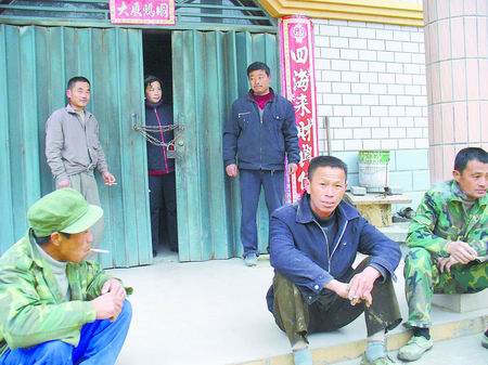 昨日上午,記者來到許德成家,院子里有幾名男子,房門被一根鐵鏈鎖住,一名女子扒著門縫向外看(如圖),許德成也在屋內(nèi)。