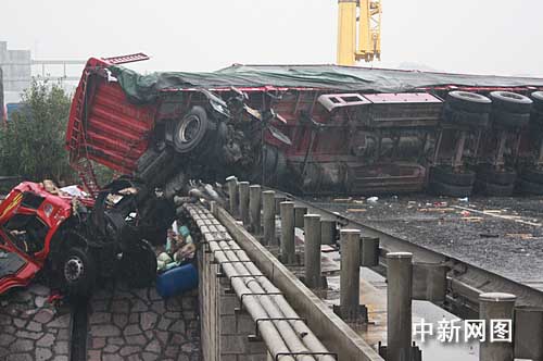 今天凌晨,一輛金華牌照的大掛車在經過衢州與常山交界處附近的芳村溪大橋時,車輛忽然發(fā)生側翻,掛車車頭撞壞中央護欄伸出橋外,掛車車身橫向將往江西方向車道全部阻擋,事故車輛上裝載有硫酸、氫氟酸等多種危險品,其中部分危險品發(fā)生泄露。